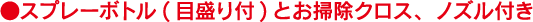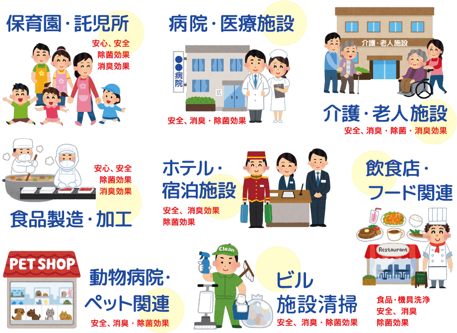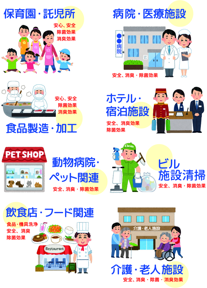 | 用途・使用場所 | ●拭き取り洗浄・汚れ落とし・消臭・除菌 ●調理直前、調理中の拭き取り洗浄と除菌 ●調理家電の内側洗浄 ●ベビー用品やリビングの洗浄と除菌 ●食事中の食べこぼしに対する拭き取り洗浄 ●ペット用品の除菌と消臭 |